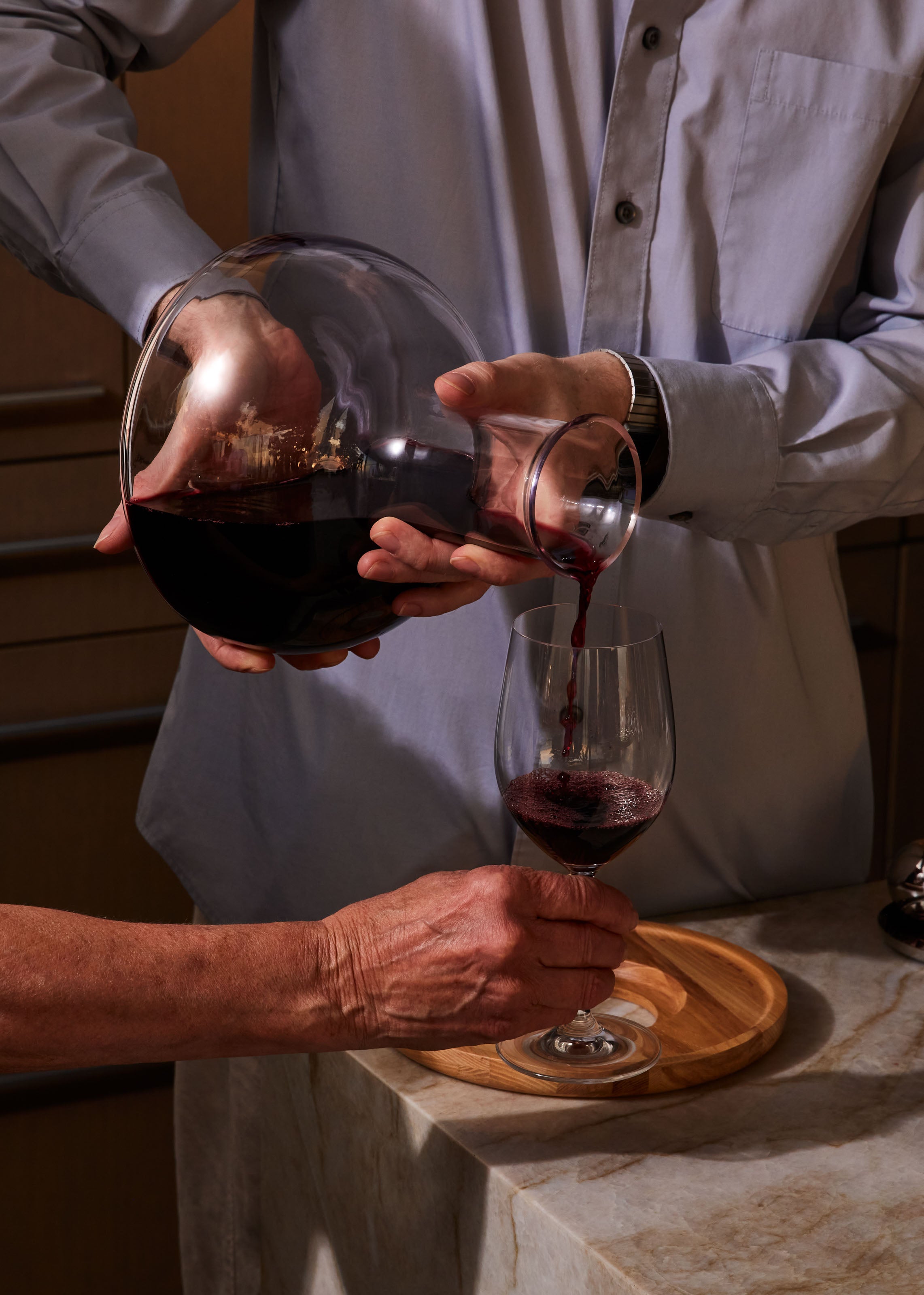 (2) Pour wine through aerator. Wine will collect in decanter.