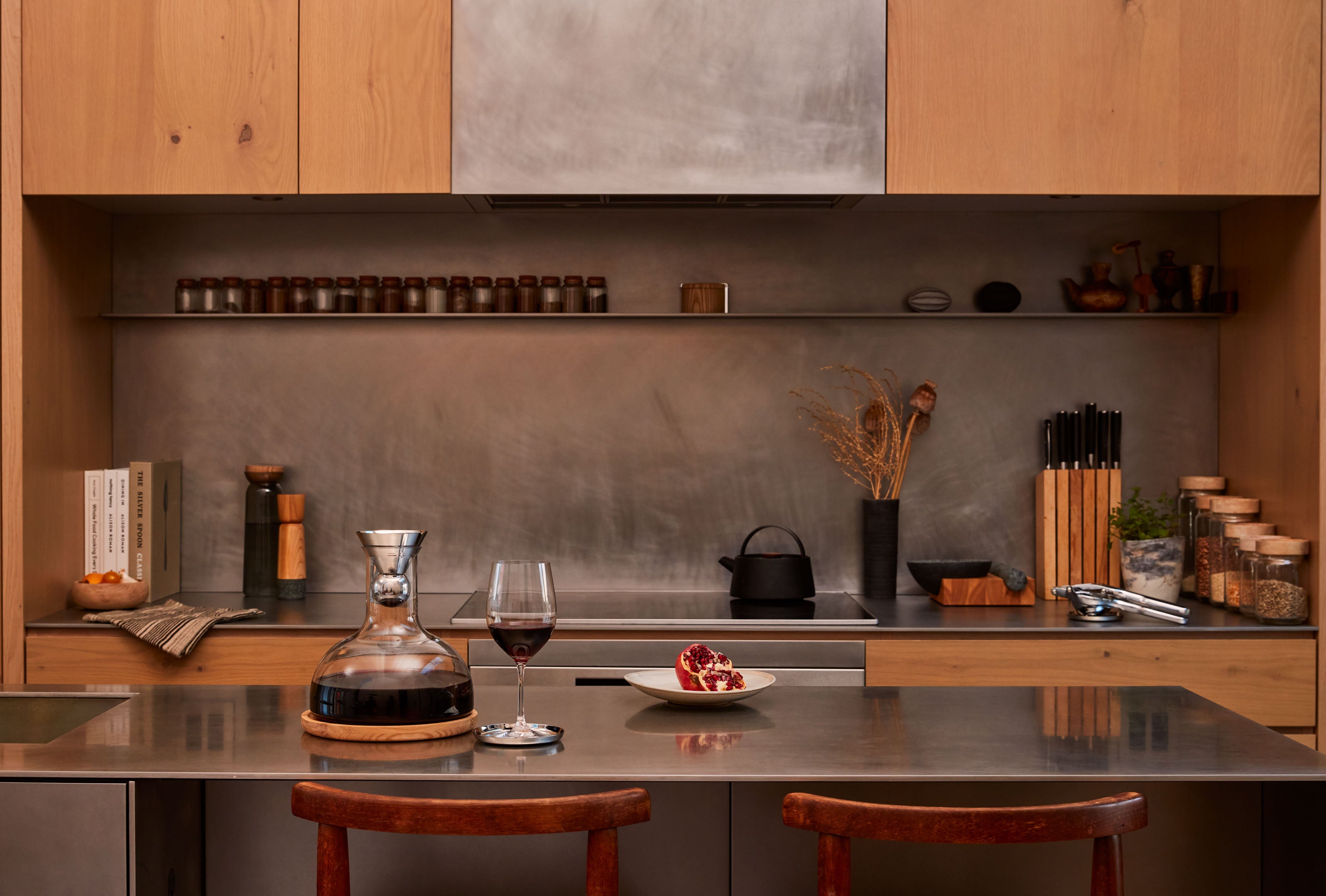 Ash wood trivet and removable metal coaster protect surfaces when serving