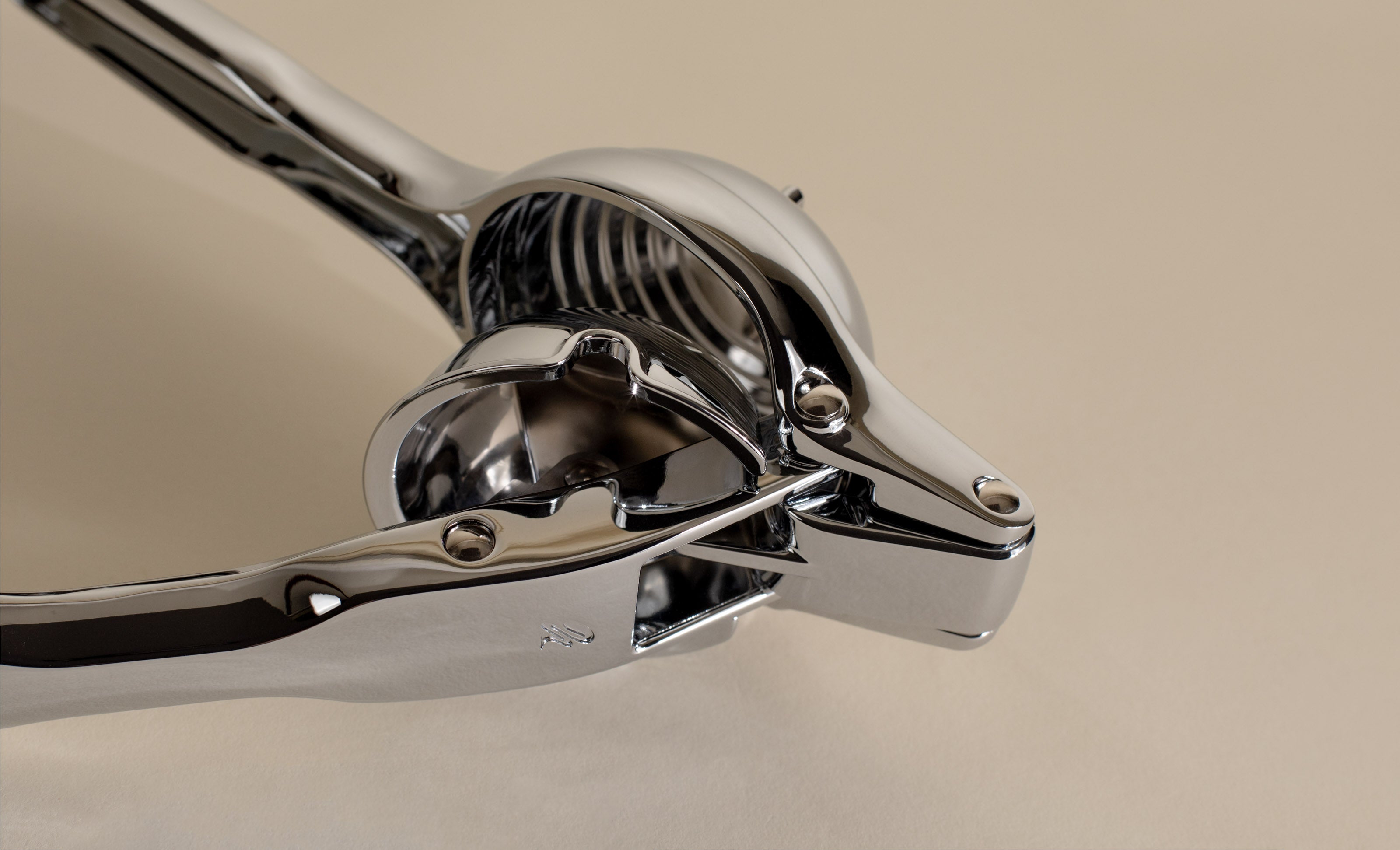 The Link Citrus Press is made up of a combination of metals to suit the function of each component best. These metals include chrome-plated aluminum, chrome-plated zinc, and food-grade stainless steel.