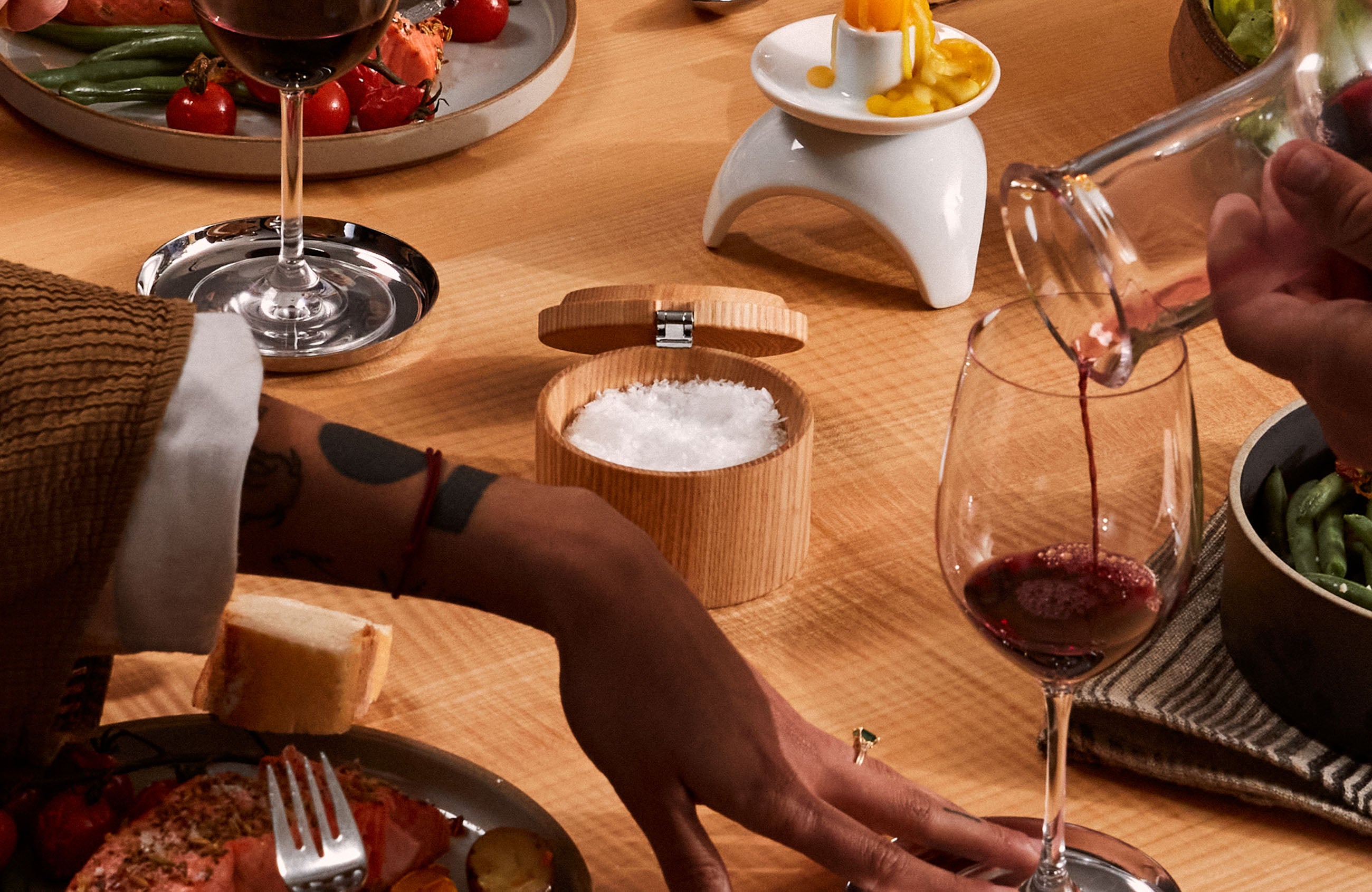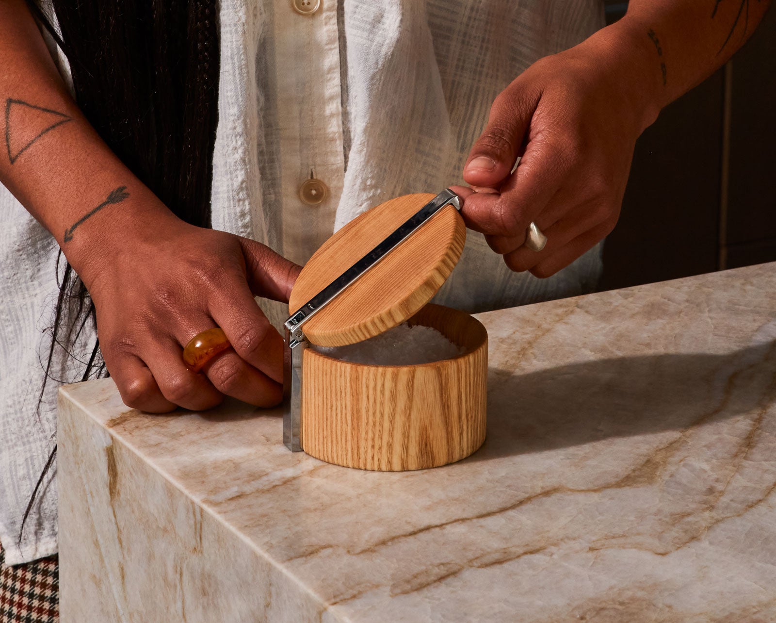 To clean, wipe with a damp cloth. Dry the interior thoroughly before storing salt.