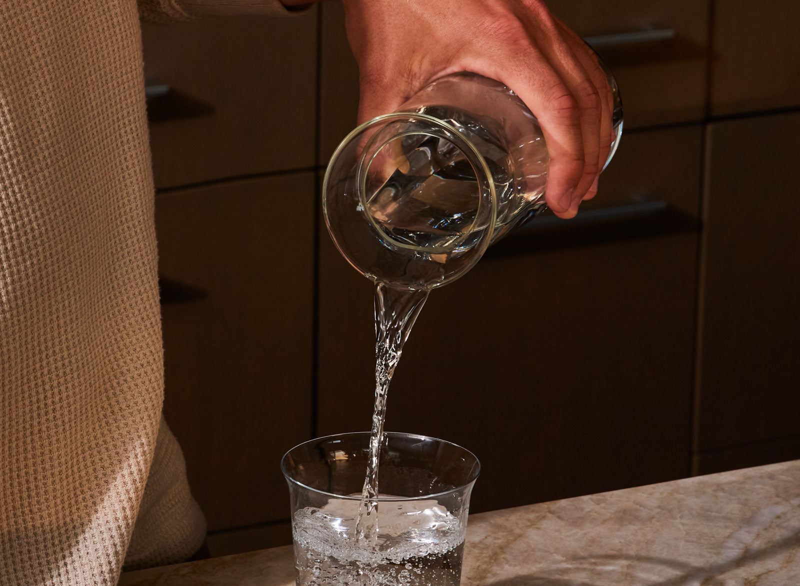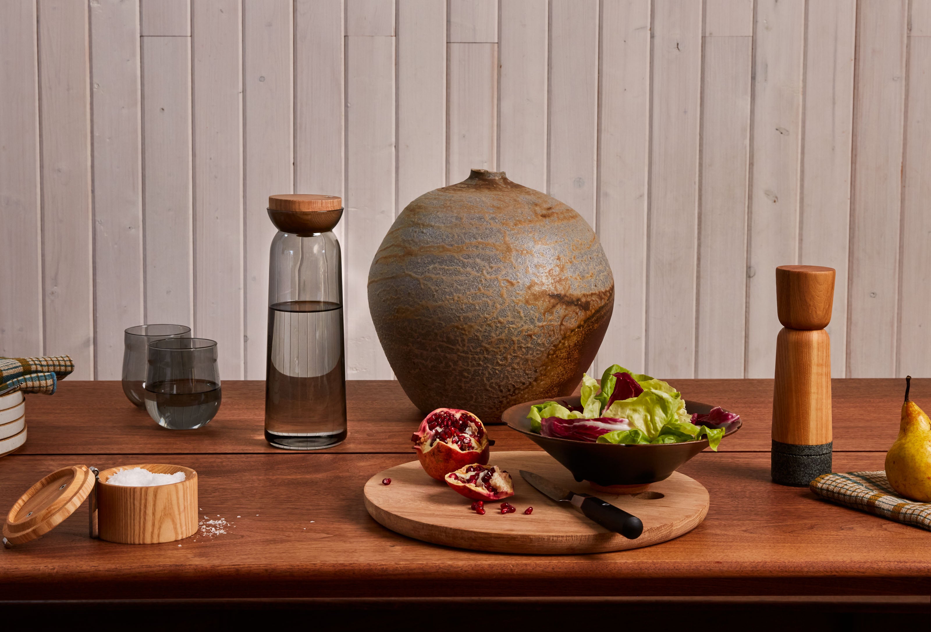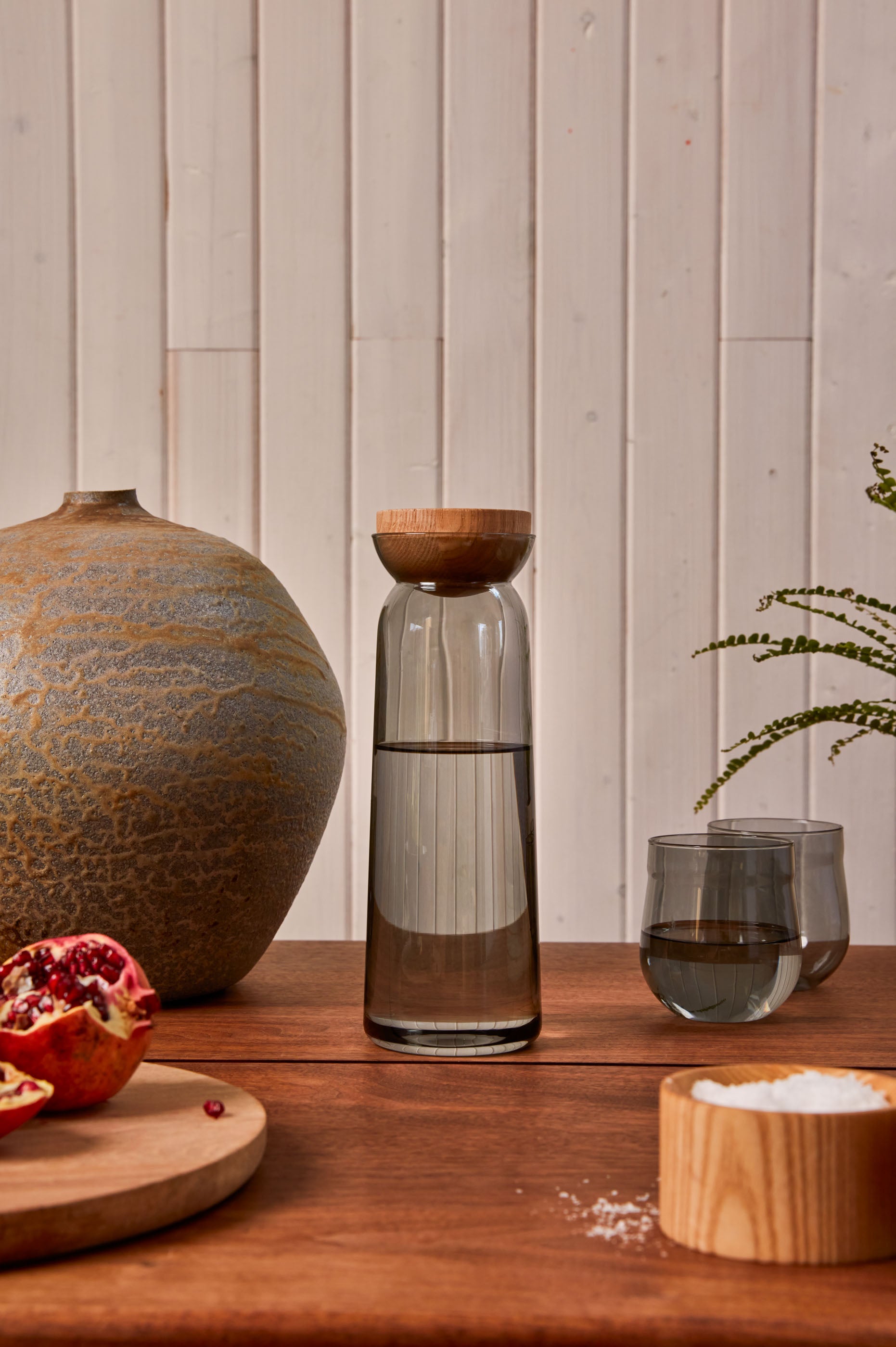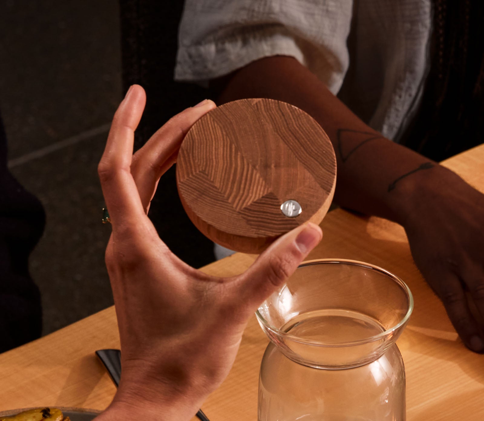 To clean, wipe the wood topper with a damp cloth. The glass vessel is dishwasher safe.
